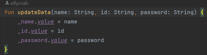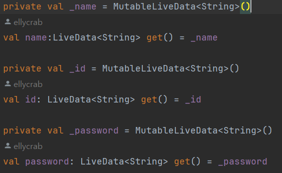 먼저 MutableLiveData를 사용하여 이름(_name), 아이디(_id), 비밀번호(_password)를 저장한다.