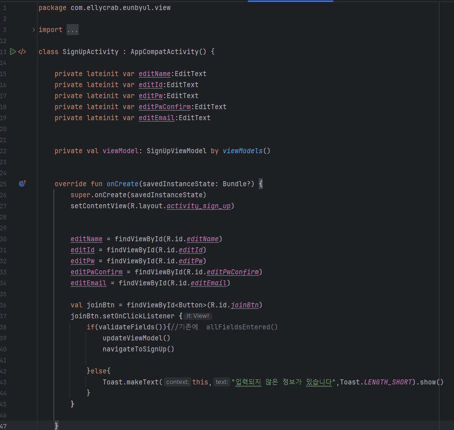 이렇게 구현된 SignUpActivity는 사용자가 회원가입을 할 수 있는 화면을 제공하고, 입력된 정보를 ViewModel에 전달하여 관리한다.