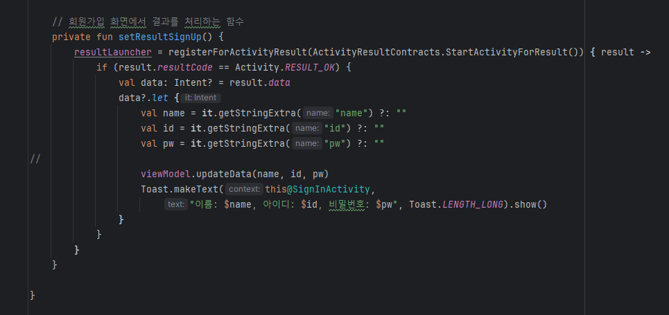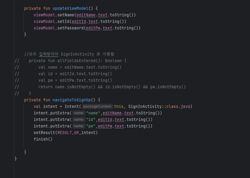 - navigateToSignUp() 메서드를 호출하여 회원가입이 성공했음을 나타내는 결과 코드와 함께 SignInActivity로 이동한다. 이때, 사용자가 입력한 정보는 Intent의 extra로 실려서 전달된다.