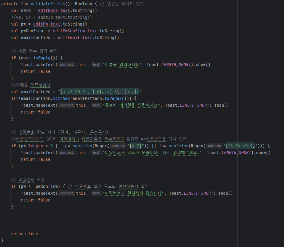 - 사용자가 회원가입 버튼을 클릭하면 validateFields() 메서드를 호출하여 입력된 정보의 유효성을 검사한다. 입력 필드에 대한 유효성 검사를 수행하고, 문제가 있을 경우에는 Toast 메시지를 표시하여 사용자에게 알린다.