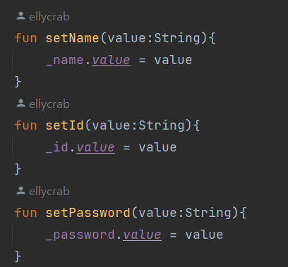 그 후 setName(), setId(),setPassword() 함수를 통해 각각의 데이터를 설정하고 이 함수들은 내부적으로 MutableLiveData의 값을 설정한다.