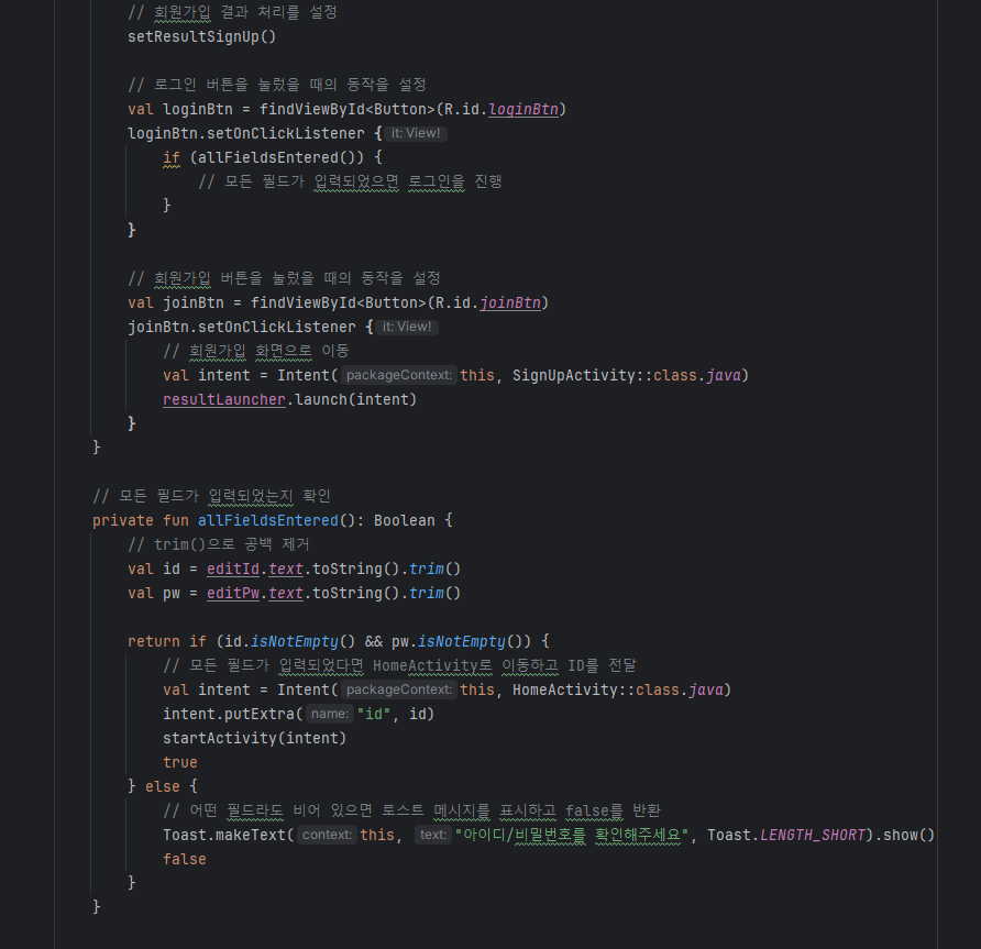 - 회원가입 버튼을 클릭하면 resultLauncher를 사용하여 회원가입 화면으로 이동한다. 이 때, registerForActivityResult() 함수를 사용하여 회원가입 화면에서 전달된 데이터를 처리한다.