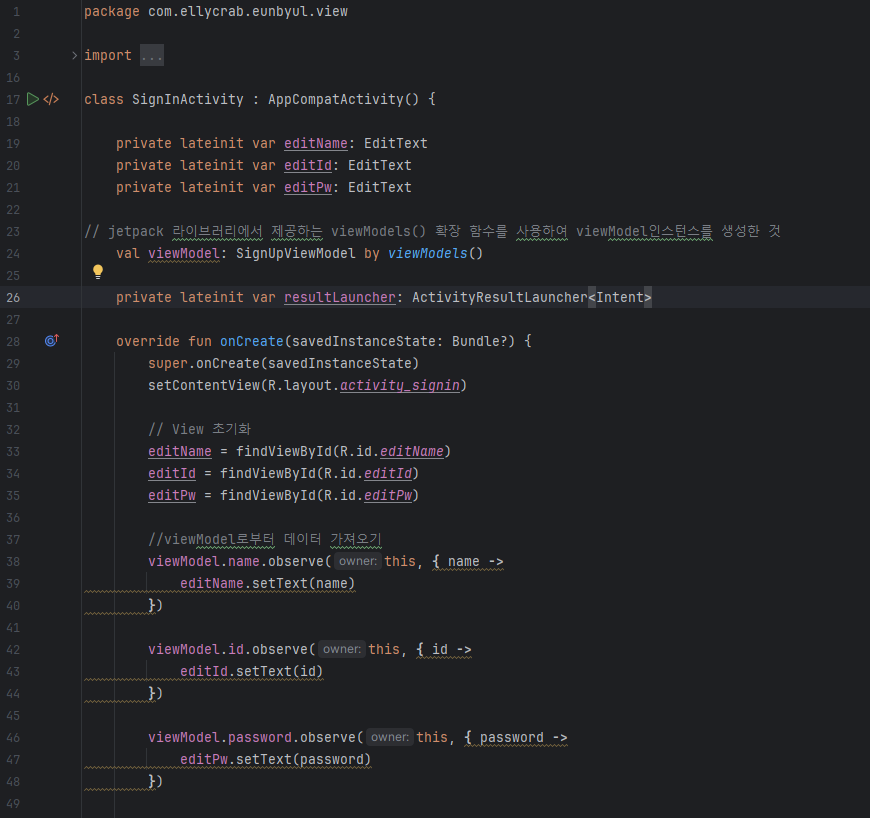 - viewModel에서 관찰 가능한 LiveData를 통해 회원가입 화면에서 입력한 데이터를 관찰한다. 이 데이터는 이름, 아이디, 비밀번호에 해당한다. 데이터가 변경되면 해당하는 EditText에 해당 데이터를 설정하여 사용자가 입력한 내용을 보여준다.