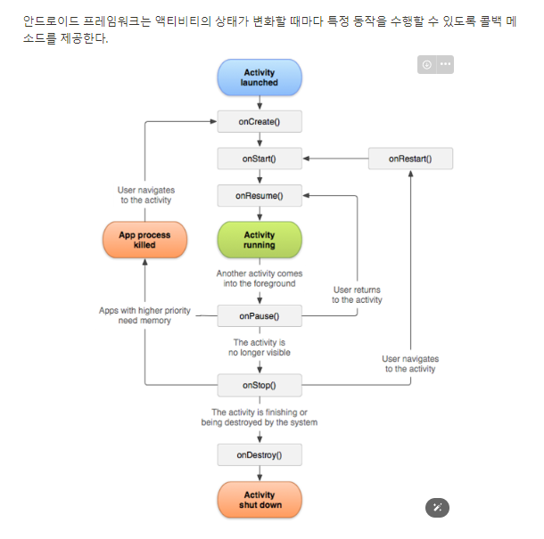 onCreate(): 액티비티가 생성될 때 호출되며 사용자 인터페이스 초기화에 사용됨