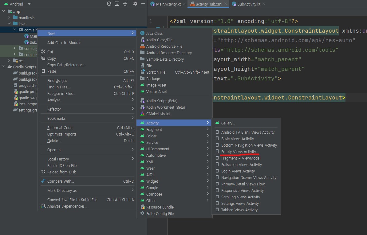 그 후 화면이 전환되는 프로젝트이기에 MainActivity 말고 SubActivity와 그에 딸린 화면(activity_sub.xml)