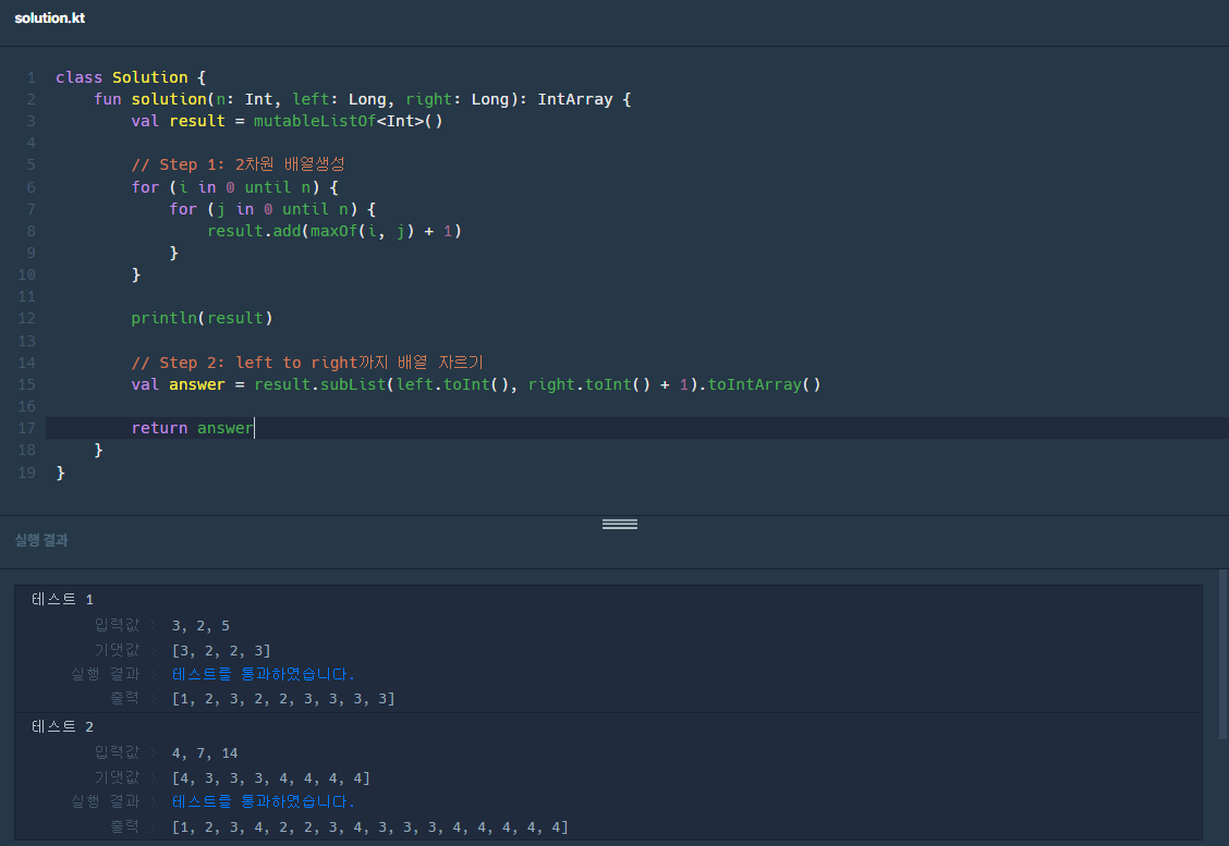 - 2.코드 동작 로직: 2중 for문을 이용해 주어진 nxn 크기의 2차원 직사각형을 채워나가는것처럼 코드 작성함 배열의 요소값은 현재 행과 열중 큰 값을 선택 후 1을 더함 그 후 완성된result 배열을 이용해서 left인덱스에서 right 인덱스까지 자름