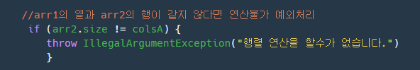 그리고 arr1의 열과 arr2의 행의 크기가 같지 않다면 예외처리를 했다.