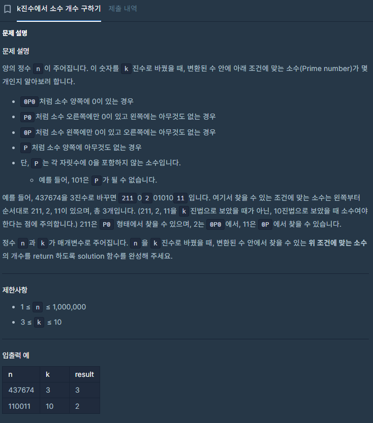 먼저 n이라는 정수를 k진수로 변환하는 과정이 필요했다.