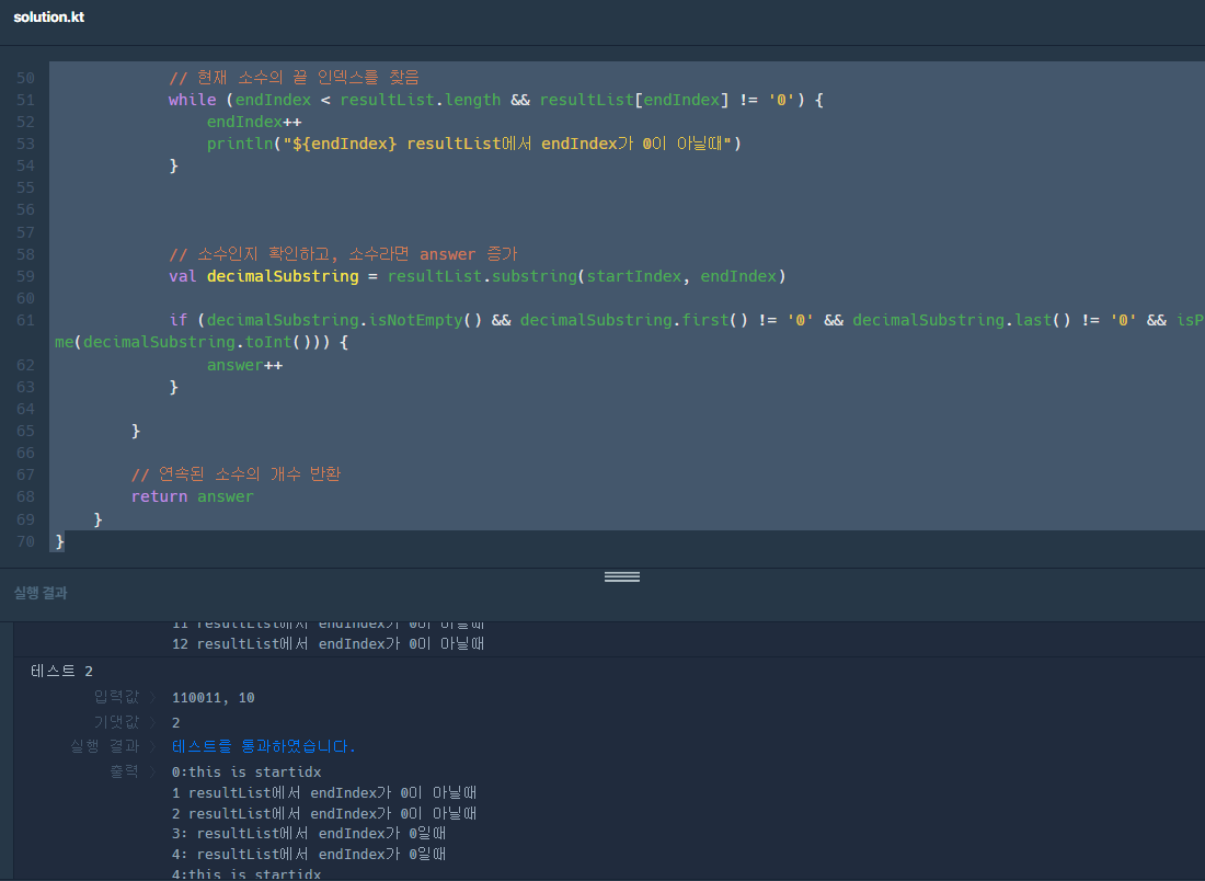 이제 변환된 숫자를 순회하며 연속된 소수를 찾는 과정이 필요했다.